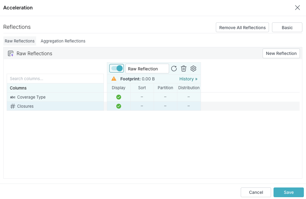 - If there is only one aggregation Reflection for the table or view, in the Basic view, click the toggle switch in the Raw Reflections bar.